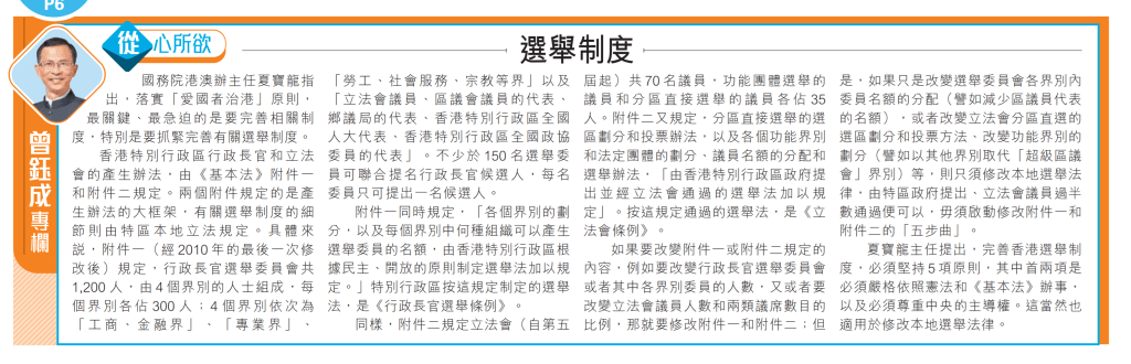 國務院港澳辦主任夏寶龍指出,落實「愛國者治港」原則,最關鍵、最急逼的是要完善相關制度,特別是要抓緊完善有關選舉制度。