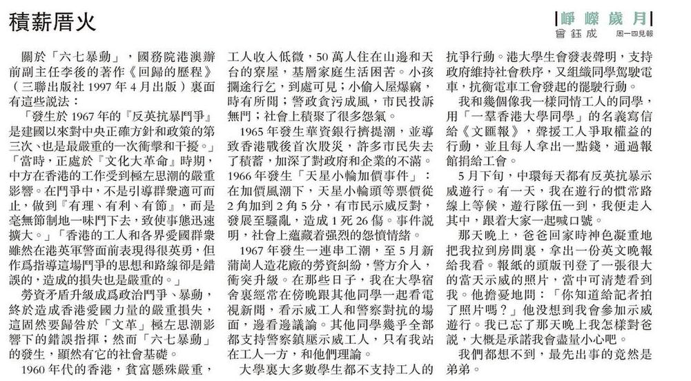 關於「六七暴動」,國務院港澳辦前副主任李後的著作《回歸的歷程》(三聯出版社1997 年4 月出版)裏面有這些說法: