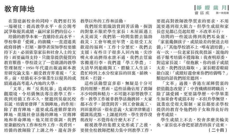 「文革」和「反英抗暴」造成的客觀環境,令培僑無法專注教學工作。我到培僑工作不久,便聽到吳康民校長說,培僑要發揮「五個陣地」的作用:除了教育陣地,還要成為連繫群眾的陣地、組織社會活動的陣地、宣傳陣地和革命陣地。他又經常強調,我們要兼顧校內工作和校外工作。我看到,培僑的教師除了上課之外,還有許多教學以外的工作和活動。