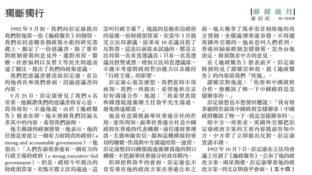 在《施政報告》發表前夕,彭定康特別約見了譚耀宗和我,就《施政報告》的內容給我們「吹風」。