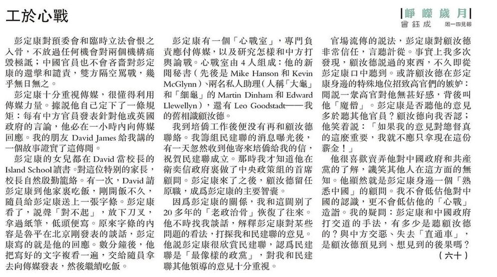 他很喜歡賣弄他對中國政府和共產黨的了解,譏笑其他人在這方面的無知。他顯然就是彭定康身邊一個「熟悉中國」的顧問。我不會低估他對中國的認識,更不會低估他的「心戰」造詣。我的疑問:彭定康和中國政府打交道的手法, 有多少是聽顧汝德的?與中方交惡、失去「直通車」,是顧汝德預見到、想見到的後果嗎?(六十)