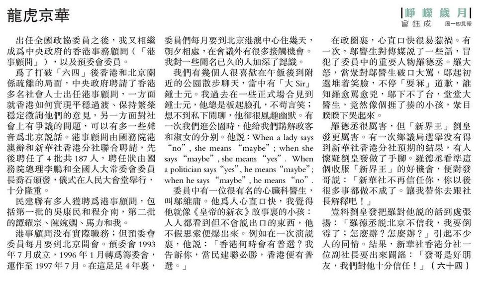 港事顧問沒有實際職務;但預委會委員每月要到北京開會。預委會1993年7月成立,1996年1月轉為籌委會,運作至1997年7月。在這足足4年裏,委員們每月要到北京港澳中心住幾天,朝夕相處,在會議外有很多接觸機會。我對一些聞名已久的人加深了認識。