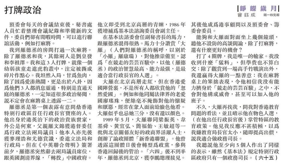 我到羅德丞的房間打過一次麻將。除了羅德丞和我,其餘兩人是劉皇發和李祖澤。我和這3 人打牌,就像一個幼弱孩童走進虎豹叢中,注定被撕成碎片作點心。我坦然入局,甘為魚肉,除了因為愛湊熱鬧,更是出於八卦,因為他們3 人都消息靈通,特別是直通天庭的羅德丞,一定知道很多政治秘聞,說不定會在麻將桌上透露一二。