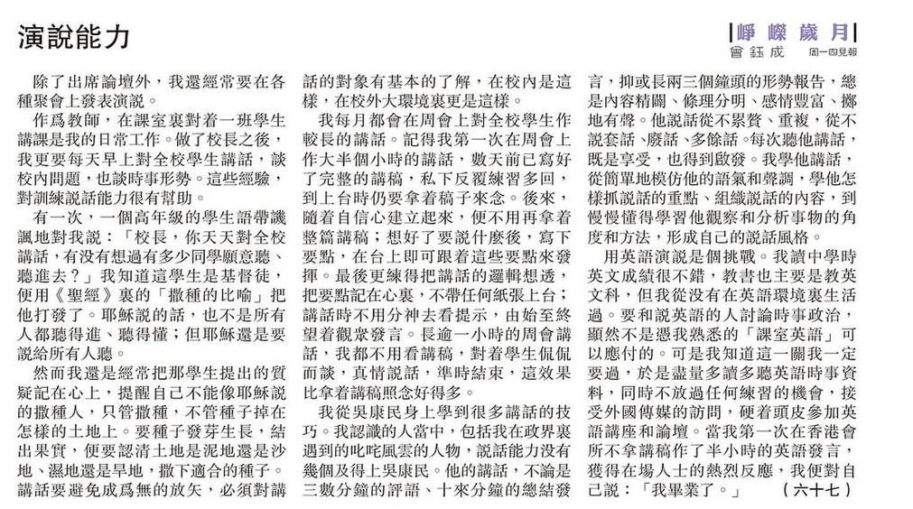 作為教師,在課室裏對着一班學生講課是我的日常工作。做了校長之後,我更要每天早上對全校學生講話,談校內問題,也談時事形勢。這些經驗,對訓練說話能力很有幫助。