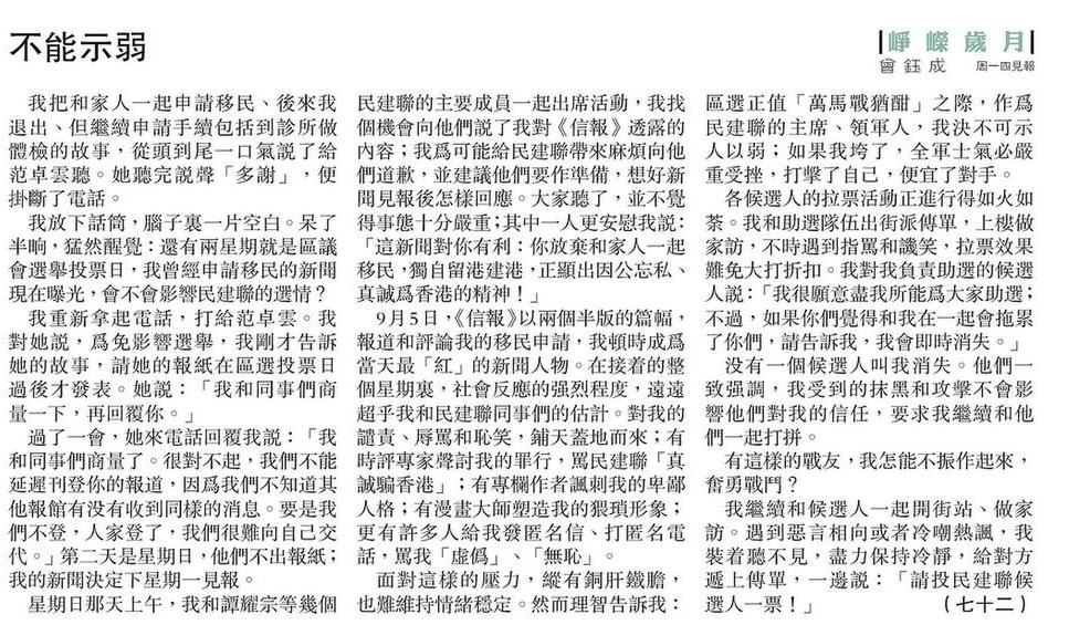 我重新拿起電話,打給范卓雲。我對她說,為免影響選舉,我剛才告訴她的故事,請她的報紙在區選投票日過後才發表。她說:「我和同事們商量一下,再回覆你。」