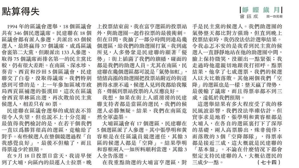這選舉結果有多大程度受了我的移民風波影響,我們沒法準確估計。但實事求是地看,張學明和黃容根都是大埔人,在各自的選區裏打下了深厚的基礎,兩人高票勝出,殊非僥倖;而落敗的3 個「空降部隊」,得票率都是接近三成,這大概就是民建聯的「基本盤」。不論在什麼情况下都會堅定支持民建聯的人,大概佔選民的三成少一點。 (七十四)
