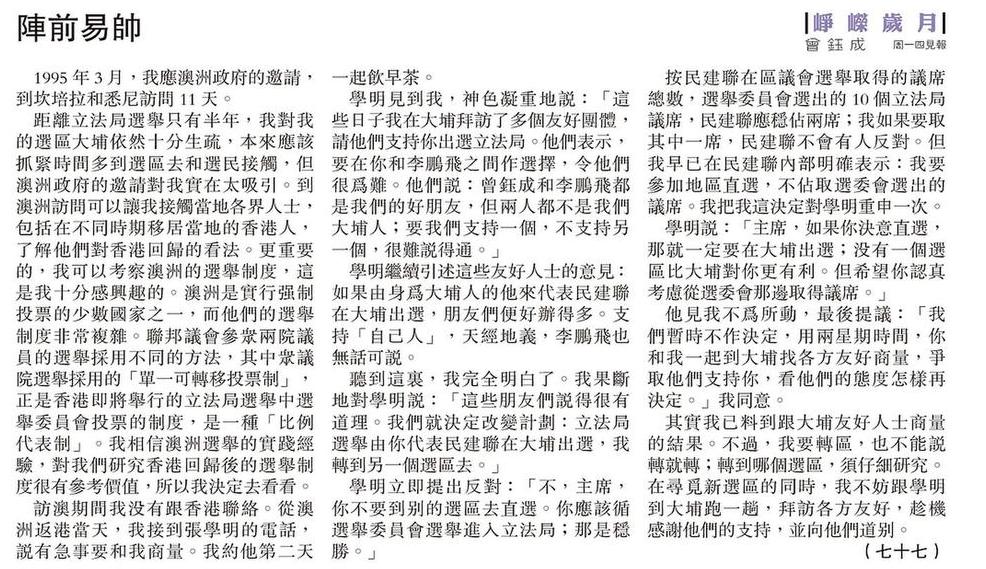 其實我已料到跟大埔友好人士商量的結果。不過,我要轉區,也不能說轉就轉;轉到哪個選區,須仔細研究。在尋覓新選區的同時,我不妨跟學明到大埔跑一趟,拜訪各方友好,趁機感謝他們的支持,並向他們道別。(七十七)