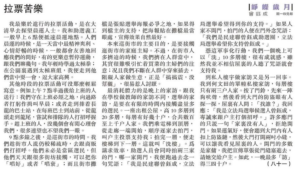 最消耗體力的是晚上的家訪。跟我在學校做教師的家訪不同,選舉的家訪,是要在有限的時間內接觸盡量多的選民。一座出租公屋,高10多層到20多層,每層有好幾十戶,合共數百至上千戶人家。我們乘電梯到頂層,從走廊一端開始,順序逐家去拍門,叫戶主投票支持我;拍完一層,便走樓梯到下一層。這就叫「洗樓」。為講求效率,助選人員會同時拍兩三家的門,哪一家開門,我便跑過去念一句咒語:「我是民建聯曾鈺成,立法局選舉希望得到你的支持。」如果人家不開門,拍門的人便在門外念咒語:「我們是民建聯曾鈺成助選團,立法局選舉希望你支持曾鈺成。」