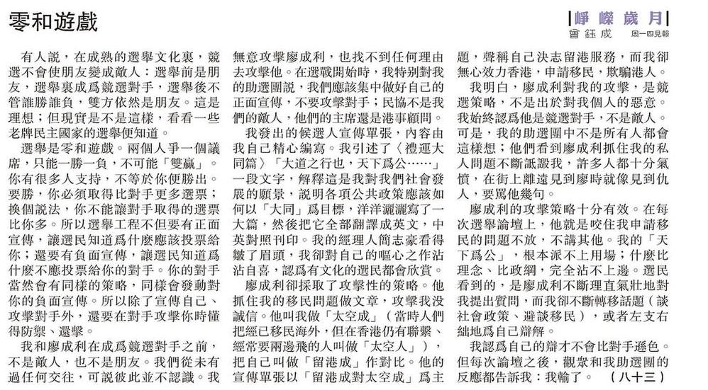 廖成利卻採取了攻擊性的策略。他抓住我的移民問題做文章,攻擊我沒誠信。他叫我做「太空成」(當時人們把經已移民海外,但在香港仍有聯繫、經常要兩邊飛的人叫做「太空人」),把自己叫做「留港成」作對比。他的宣傳單張以「留港成對太空成」為主題,聲稱自己決志留港服務,而我卻無心效力香港,申請移民,欺騙港人。