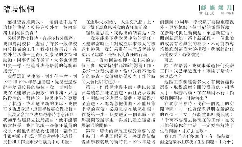 我從籌組民建聯,到出任主席,到1993 和1994 年參加助選,從沒想過要辭去培僑校長的職位。我一直相信,我在民建聯要承擔繁忙的事務,只是階段性的、暫時的,待民建聯的發展上了軌道,或者選出新的主席,我便可以功成身退,返回學校專心做校長。
