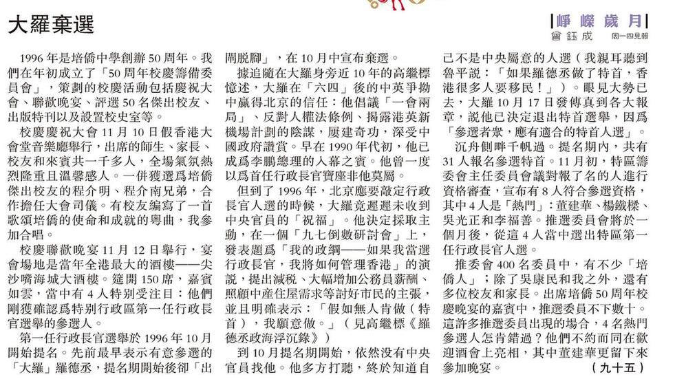 推委會400 名委員中,有不少「培僑人」;除了吳康民和我之外,還有多位校友和家長。出席培僑50 周年校慶晚宴的嘉賓中,推選委員不下數十。這許多推選委員出現的場合,4 名熱門參選人怎肯錯過?他們不約而同在歡迎酒會上亮相,其中董建華更留下來參加晚宴。 (九十五)