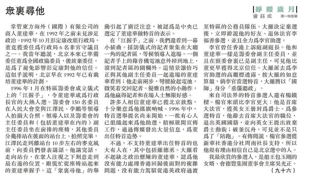 掌管東方海外(國際)有限公司的商人董建華,在1992 年之前未見涉足政治。1992 年10 月彭定康改組行政局,董竟獲委任為行政局6 名非官守議員之一。我當年聽說,北京本來已準備委任董為全國政協委員,後放棄委任,是為了避免影響彭定康對他的信任。這似乎說明,北京早在1992 年已有栽培董建華的計劃。