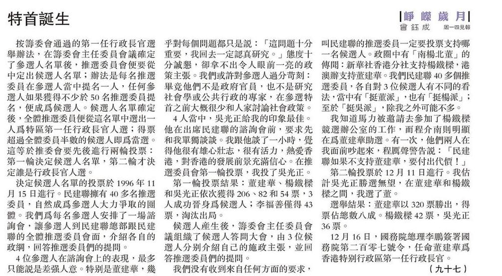12 月16 日,國務院總理李鵬簽署國務院第二百零七號令,任命董建華為香港特別行政區第一任行政長官。(九十七)