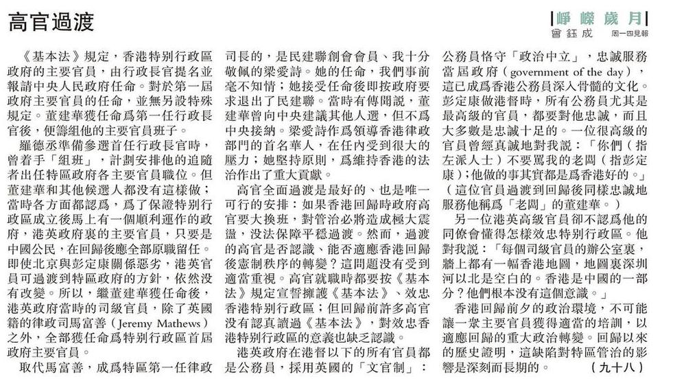 高官全面過渡是最好的、也是唯一可行的安排:如果香港回歸時政府高官要大換班,對管治必將造成極大震盪,沒法保障平穩過渡。然而,過渡的高官是否認識、能否適應香港回歸後憲制秩序的轉變?這問題沒有受到適當重視。高官就職時都要按《基本法》規定宣誓擁護《基本法》、效忠香港特別行政區;但回歸前許多高官沒有認真讀過《基本法》,對效忠香港特別行政區的意義也缺乏認識。