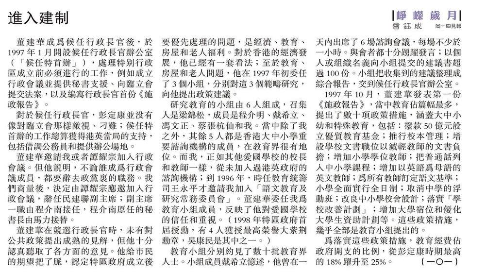 為落實這些政策措施,教育經費佔政府開支的比例,從彭定康時期最高的18% 躍升至25%。 (一〇一)