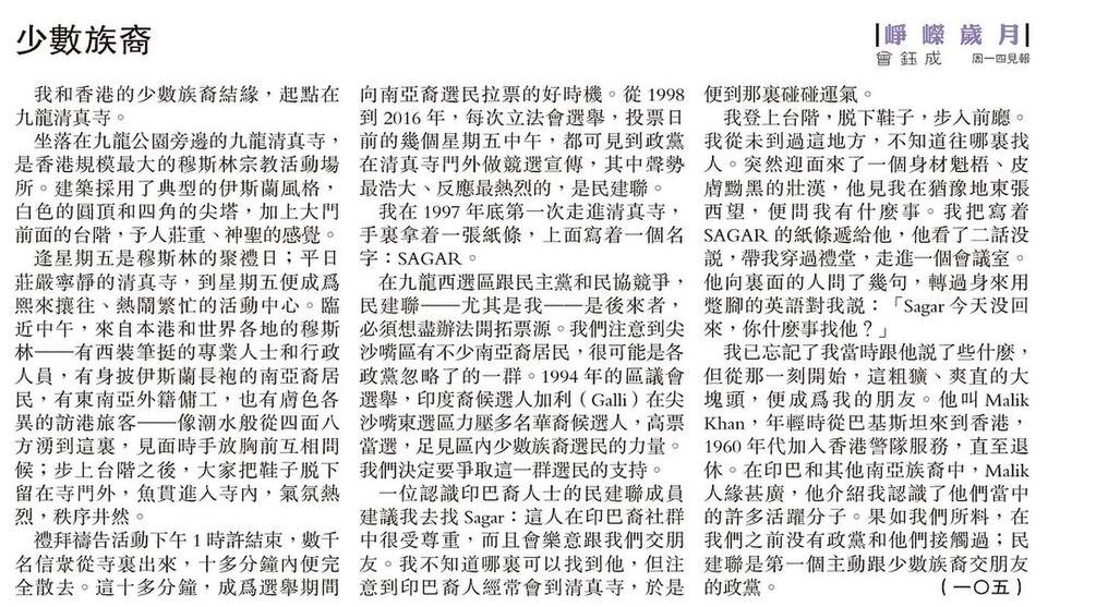 我登上台階,脫下鞋子,步入前廳。我從未到過這地方,不知道往哪裏找人。突然迎面來了一個身材魁梧、皮膚黝黑的壯漢,他見我在猶豫地東張西望,便問我有什麼事。我把寫着 SAGAR的紙條遞給他,他看了二話沒說,帶我穿過禮堂,走進一個會議室。他向裏面的人問了幾句,轉過身來用蹩腳的英語對我說:「Sagar今天沒回來,你什麼事找他?」 我已忘記了我當時跟他說了些什麼,但從那一刻開始,這粗獷、爽直的大塊頭,便成為我的朋友。他叫Malik Khan,年輕時從巴基斯坦來到香港,1960年代加入香港警隊服務,直至退休。在印巴和其他南亞族裔中,Malik人緣甚廣,他介紹我認識了他們當中的許多活躍分子。果如我們所料,在我們之前沒有政黨和他們接觸過;民建聯是第一個主動跟少數族裔交朋友的政黨。(一〇五)