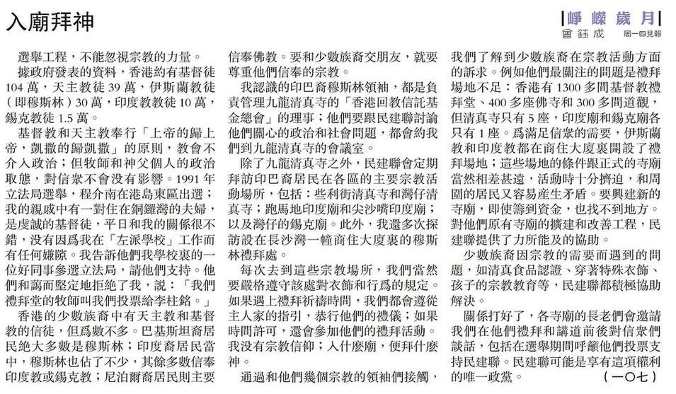 關係打好了,各寺廟的長老們會邀請我們在他們禮拜和講道前後對信眾們談話,包括在選舉期間呼籲他們投票支持民建聯。民建聯可能是享有這項權利的唯一政黨。 (一〇七)