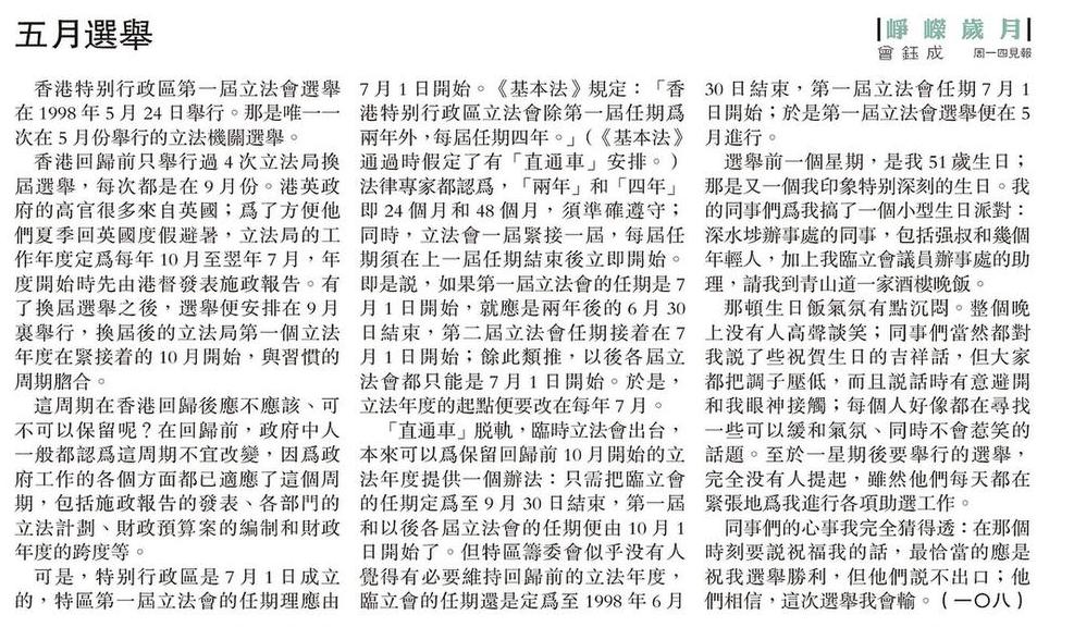 「直通車」脫軌,臨時立法會出台,本來可以為保留回歸前10 月開始的立法年度提供一個辦法:只需把臨立會的任期定為至9 月30 日結束,第一屆和以後各屆立法會的任期便由10 月1日開始了。但特區籌委會似乎沒有人覺得有必要維持回歸前的立法年度,臨立會的任期還是定為至1998 年6 月30 日結束,第一屆立法會任期7 月1日開始;於是第一屆立法會選舉便在5月進行。