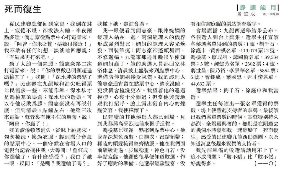 過了大約一個鐘頭,簡志豪第二次打電話來,說:「你的票數已明顯超過馮檢基了。」我問:「深水埗的票點了嗎?」民建聯在九龍城和油尖旺得票比民協多一些,不能作準。深水埗才是馮檢基的票倉;深水埗的選票,可以令他反敗為勝。簡志豪沒有再說什麼,但到清晨4 點鐘左右,他第三次來電話,聲音裏有掩不住的興奮,說:「阿曾,你贏了!」
