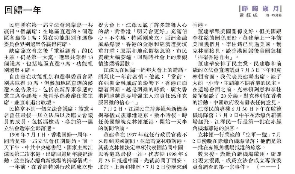 1998年7月1日,香港回歸一周年,同時是第一屆立法會任期開始。前一天下午,中共中央總書記、國家主席江澤民第二次來港,出席回歸周年慶祝活動,並主持赤鱲角新機場的揭幕儀式。