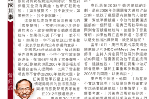 香港立法會主席曾鈺成提出下任特首需具備的條件,但他沒表示自己是否要問鼎特首,也沒表態是否支持梁振英連任。他認為香港的管治問題當中,普選是主要矛盾,如果不解決,其他的次要矛盾也就更難根本性地解決。