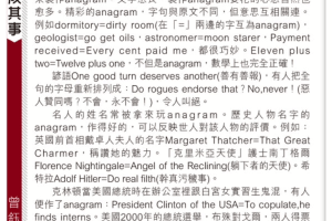 名人的姓名常被拿來玩anagram。特朗普和希拉莉的名字就有不少anagrams,例如有Donald Trump = Damp old runt,Hillary Clinton = Only I can thrill。我拿幾個香港公眾人物的名字作anagrams,看讀者能否猜到他們是誰。