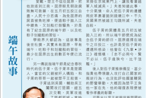 春秋時代的伍子胥本是楚國人,他當官的父親被楚平王殺害,子胥逃到吳國,輔助吳王打敗了楚國。其後吳越開戰,吳軍大敗越軍,越王勾踐投降。伍子胥主張徹底消滅越國,吳王夫差不聽,反指伍子胥謀反,賜劍叫他自盡,並在端午日把伍子胥的屍體抛到河中。吳國後來果然為越王勾踐所滅,端午節成為紀念伍子胥的節日。