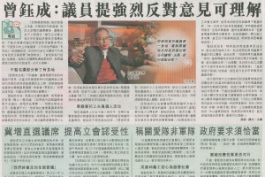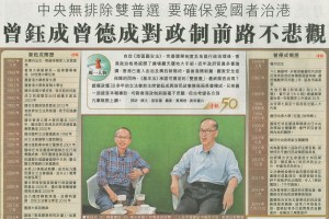 前立法會主席曾鈺成接受本報專訪時認為,林鄭上任後應先易後難,如先處理教育等較易凝聚共識的議題,為新政府「集民氣」,待營造有利環境後才處理政改、23條立法等具爭議議題。他又贈林鄭「通」字,盼她與港人及中央好好溝通,達至政通人和及施政通順。他又認為慶祝回歸的同時,需檢討「點解呢廿年出現一啲問題未解決」。