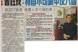 立法會主席曾鈺成早前促請中央不要拿一個政改方案迫泛民接受,他昨闡釋對2017年普選特首候選人必須符合「愛國愛港」時指,可看成「是對候選人言行的約束」,在重大政治問題上,口徑避與中央不一致。