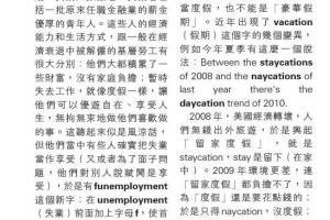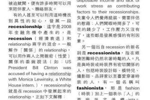 在金融危機裏出現的一些新字,反映了人們面對經濟逆境的心態,頗為有趣。有達觀的論者指出,人與人之間的關係在經濟衰退時會得到改善,因為經濟繁榮、百業興旺的時候,人們都忙着掙錢,無暇去關心家庭和朋友;但到了經濟衰退、百業萎縮,人們沒工可做,被迫賦閒,便有許多時間可以用來陪伴家人、聯絡朋友。
