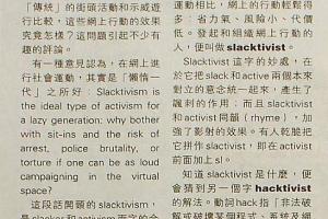 互聯網改變了人們學習、工作、娛樂、交友、消費的方式,也改變了人們議論時事、表達訴求,以至發起、組織和參與社會行動的模式。在網上蒐集民意、發動聯署、建立群組,為支持或反對某項議題凝聚力量,已成為社會運動人士或政治團體常用的手段。跟「傳統」的街頭活動和示威遊行比較,這些網上行動的效果究竟怎樣?這問題引起不少有趣的評論。