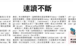 英國人說話時,如果接連的兩個字,後一個是以母音(vowel)開頭的,就會把前一個字的收尾輔音(final consonant)連到下一個字的前面。例如pick it up讀做pic-ki-tup,not at all讀做no-ta-tall。香港學生學英文,很多沒有注意這樣的“連讀”,總是一個個字分開來讀:“pick,up”,甚至不讀出結尾輔音,變成“闢”。