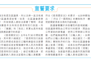 立法規定區議員宣誓,是要他們作出莊嚴承諾,不得從事違反「一國兩制」憲制秩序、與公職人員身份不相稱的行為。