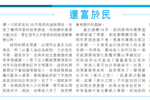 政府過去連續15年錄得的實際盈餘都遠超預算。額外的盈餘不能追加到政府的開支預算裡;全數納入庫房成為財政儲備的一部分。財政儲備已累積至逾萬億,用派錢辦法把預算以外的政府收入發還給市民,有何不可?