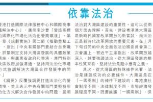 建設粵港澳大灣區,法治是基礎,是保障。習近平主席指出,改革開放越深入,越要強調法治。中央全面依法治國委員會強調,要用法治來規範政府和市場的邊界。這些論述特別適用於大灣區建設。