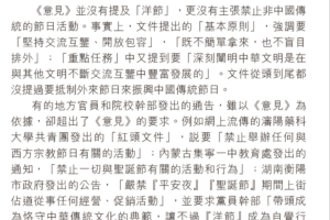 內地有一些城市和院校發出通告,禁止過「洋節」。發出這禁令的依據,是中央今年一月發出的文件《關於實施中華優秀傳統文化傳承發展工程的意見》。但其實該文件沒有提過要禁止外來節日的活動。