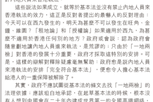 政府應該承認,基本法沒有為實行「一地兩檢」留下空間;同時說明,內地人員在嚴格的限制下在香港指定的地區內執行內地法律,是例外的、特殊的安排,沒有基本法的條文為依據,但也沒有違反一國兩制的基本方針政策。