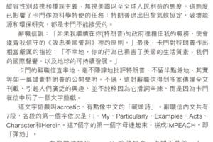 最新辭職的美國國務院科學特使卡門在Twitter發表的辭職信,等如一篇譴責特朗普的公開聲明。這封信得到多家傳媒全文刊載,並不純粹因為它措詞辛辣,而是因為卡門在信中玩了一個文字遊戲。