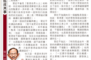 前立法會主席曾鈺成接受本報專訪時認為,林鄭上任後應先易後難,如先處理教育等較易凝聚共識的議題,為新政府「集民氣」,待營造有利環境後才處理政改、23條立法等具爭議議題。他又贈林鄭「通」字,盼她與港人及中央好好溝通,達至政通人和及施政通順。他又認為慶祝回歸的同時,需檢討「點解呢廿年出現一啲問題未解決」。