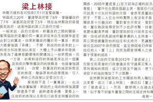 從林鄭與梁振英的工作關係和兩人職位改變的情況來看,這次「梁上林接」,應近似2005年「董上曾接」。然而,觀察兩人在過去幾天的表現,似乎看不到當年董曾交接時的互相支持和尊重。
