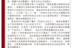 在香港使用和發展粵語和繁體字,符合「一國兩制」,也符合國家憲法規定的語文政策。《國家通用語言文字法》,指定普通話和規範漢字為國家通用語言文字。這條法律不適用於香港。不過,在香港與內地居民交往愈來愈頻繁的時候,不用政府當局制訂推廣政策,社會上對聽說普通話和認讀簡體字能力的需求,自會不斷增加。
